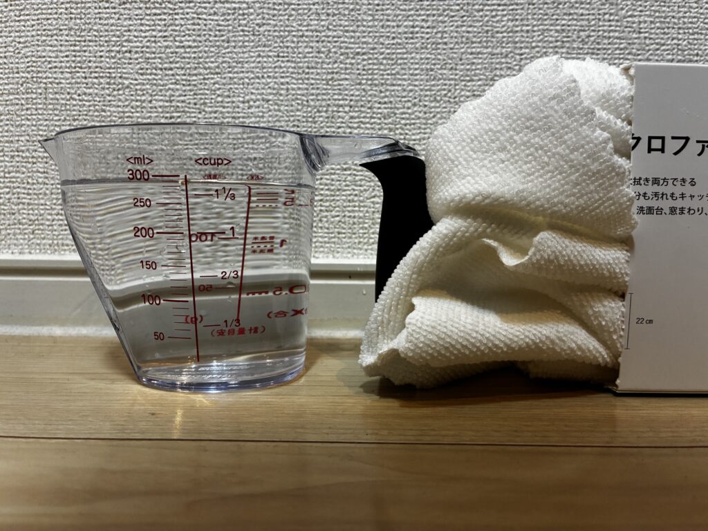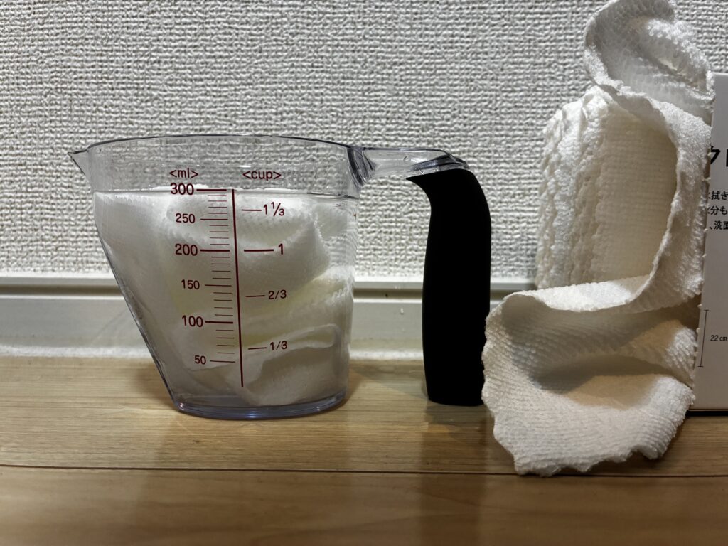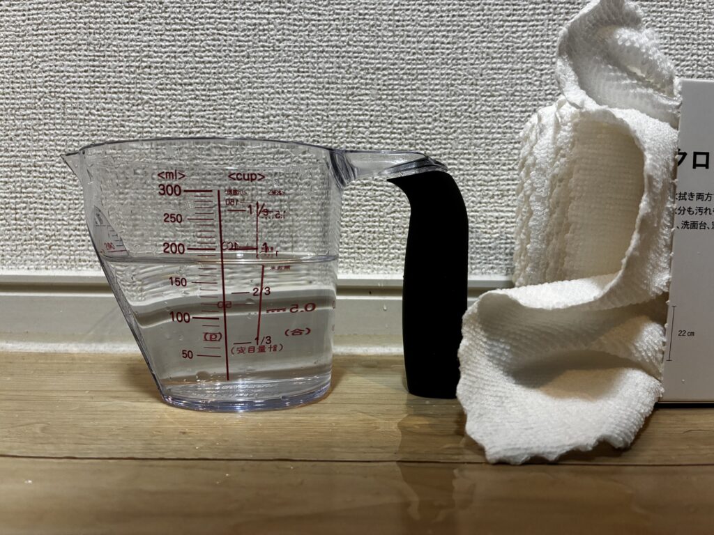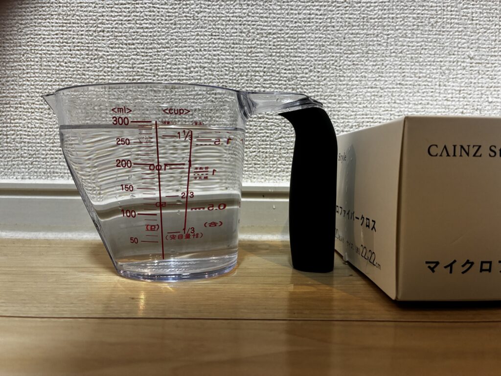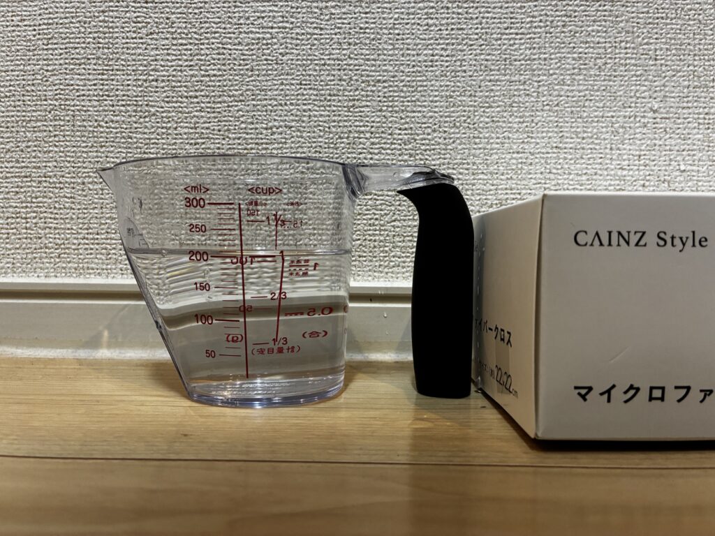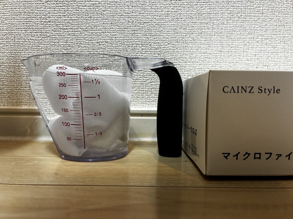 見えにくいですが、ニトリのナイロン入りマイクロファイバークロスが120ml、カインズが90mlほど良く吸水することが分かります。どちらも同じ22cm四方のためサイズは関係なく素材でこれだけ変わることが分かります。